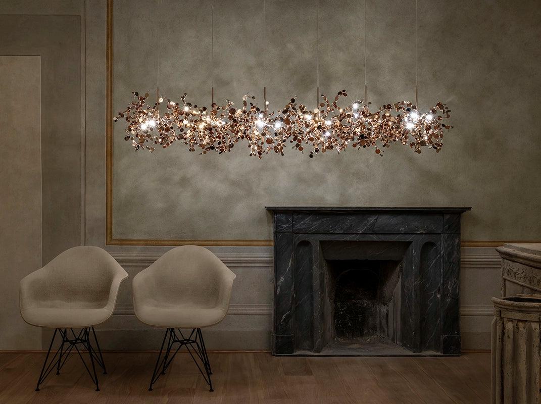 With this light, designer Dodo Arslan creates a shimmering cloud. Argent consists of metal discs that have been meticulously shaped by hand by Terzani craftsmen into clusters.