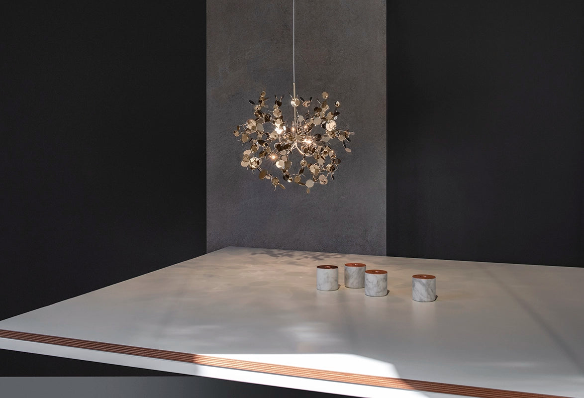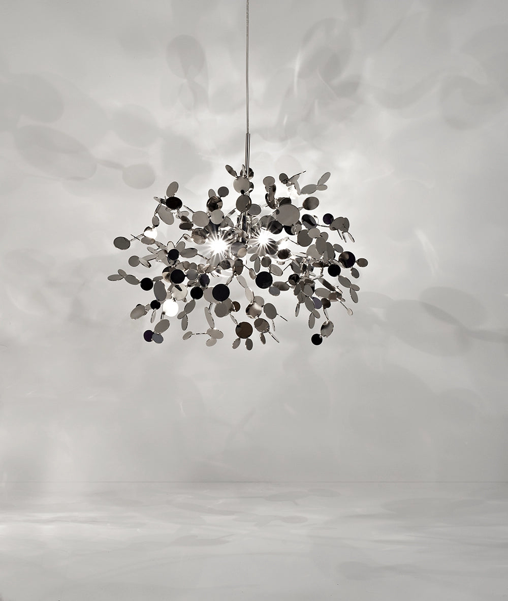 With this light, designer Dodo Arslan creates a shimmering cloud. Argent consists of metal discs that have been meticulously shaped by hand by Terzani craftsmen into clusters.