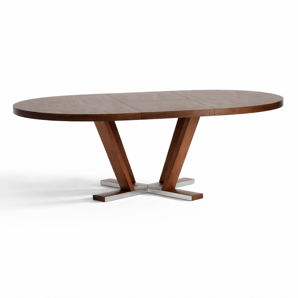 The Aura extendable table develops from a cross shape oak base, which is its distinctive element, combined with an essential extendable circular top in the same wood essence, giving it a simple yet incisive look.The bright satin aluminum profile outlines the base giving to the table its special touch.