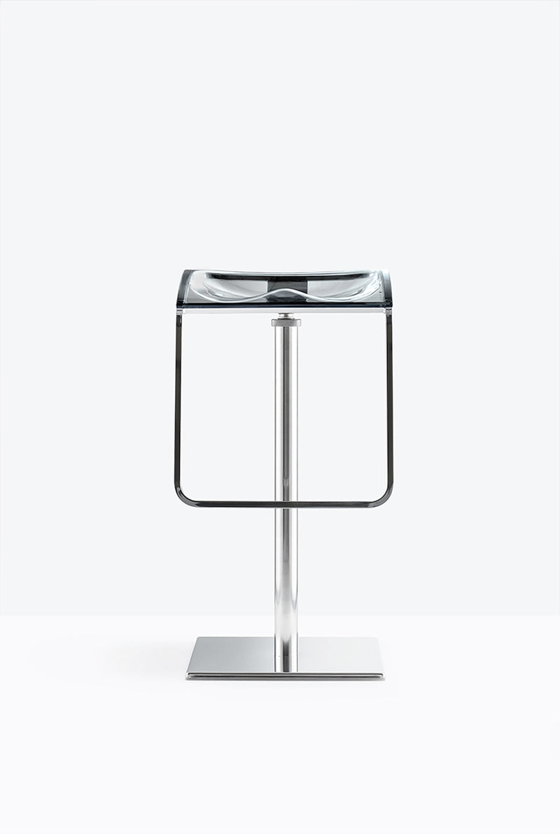 Arod is a barstool collection with shaped seat in polycarbonate, that stands out for its ergonomic character. Swivel barstool with seat return system, stainless steel square base, central column and footrest in steel.