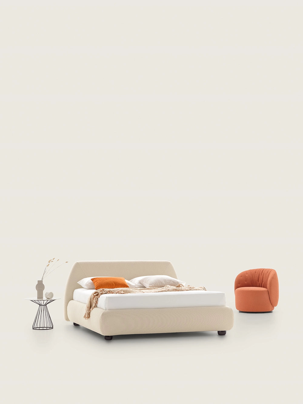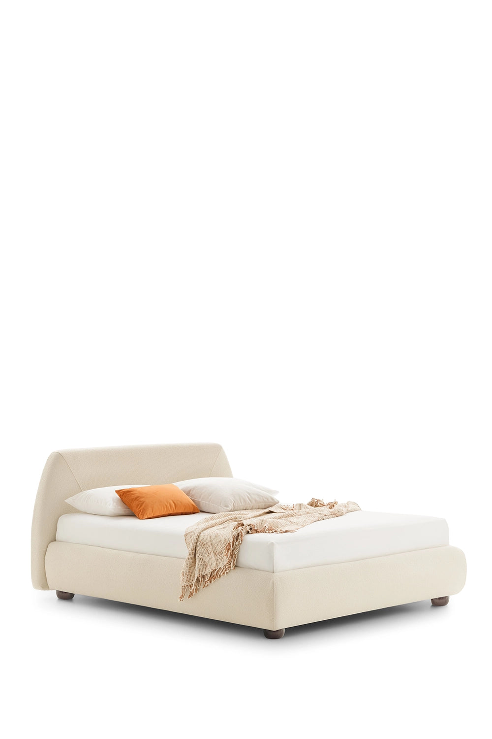 Robust and firm, the plane on which is balanced the curved line of the horizon, suggested by the curved seams of the headboard: a bed that becomes a metaphor of the world. The compact base of Belmondo encloses, almost like a living heart, a large container, lined on the outside with an elegant Eco-leather covering.