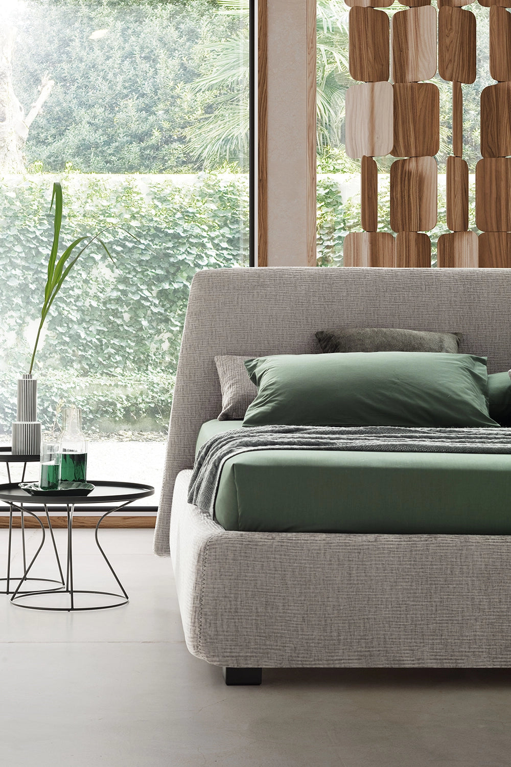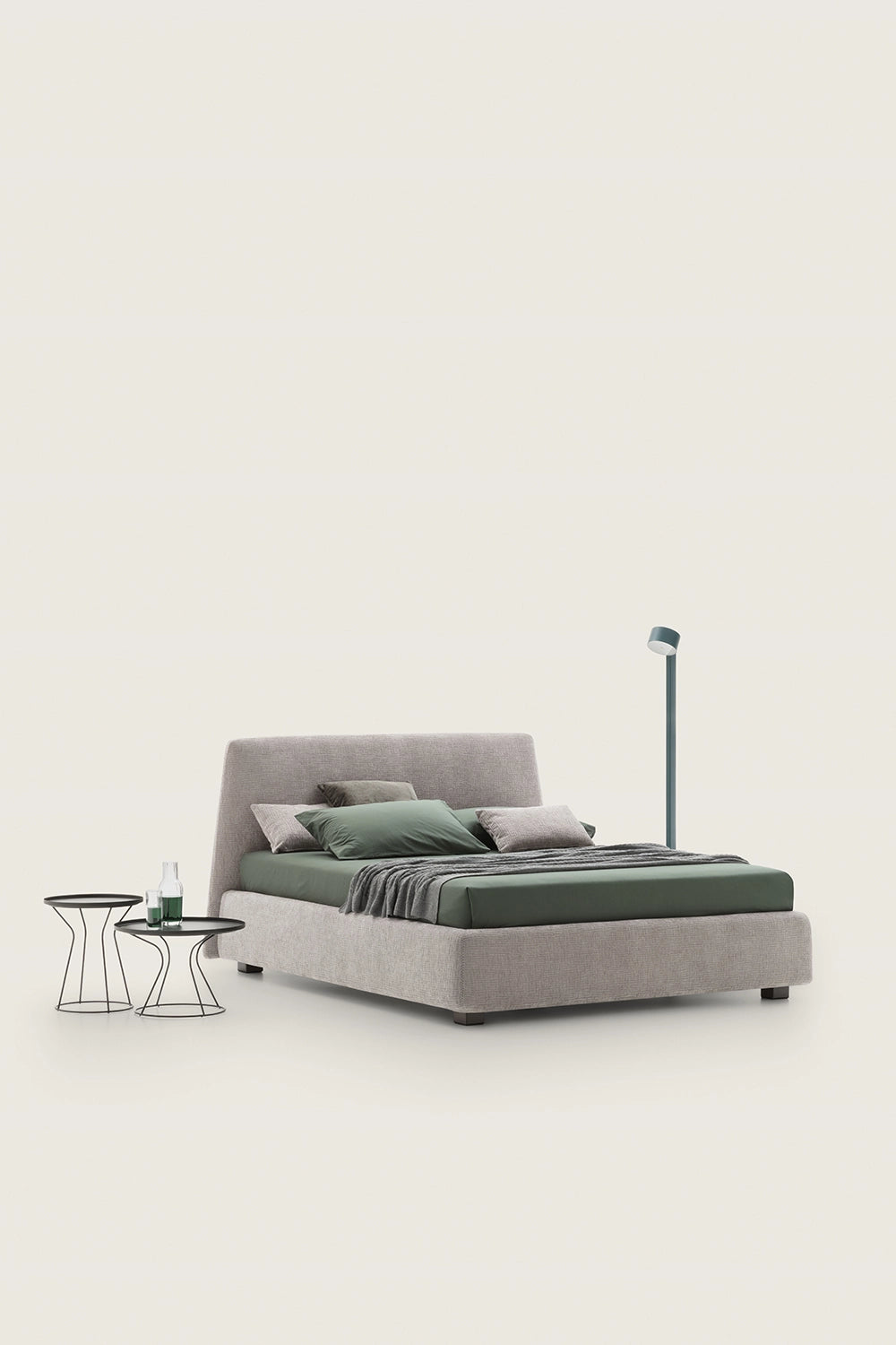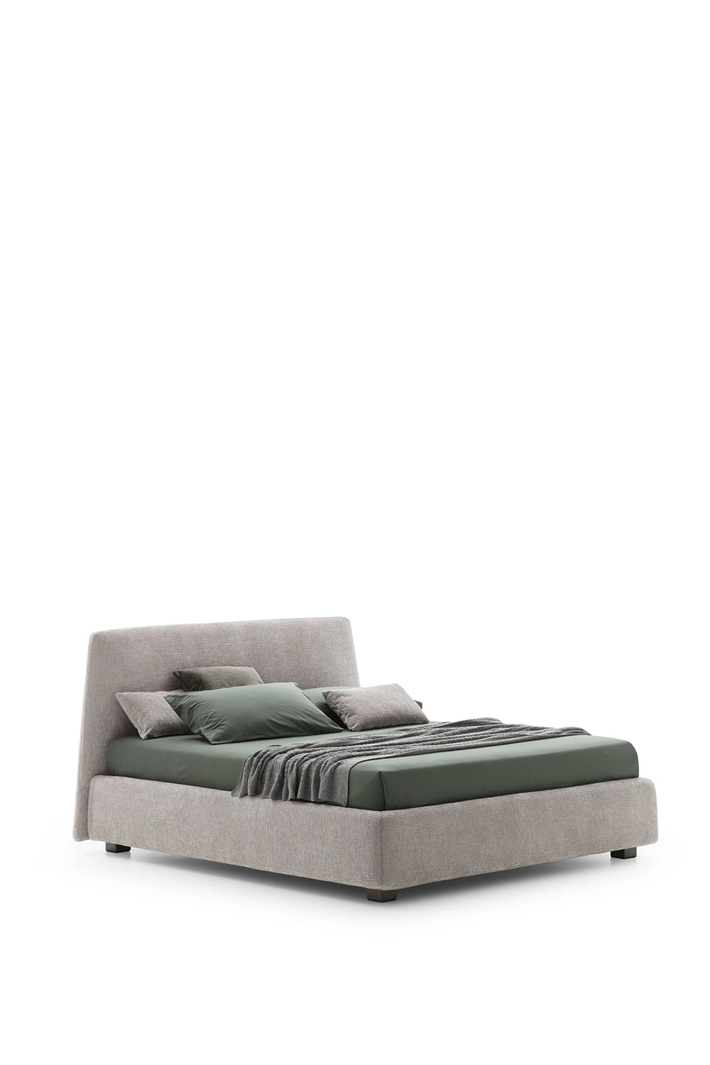 Bed with a solid upholstered container base whose delicate lateral flaring footboard, highlighted by an original and lively relief zig zag seam, projects the remarkable profile of an unusual headboard, in a perfect combination of design and geometric ratio.