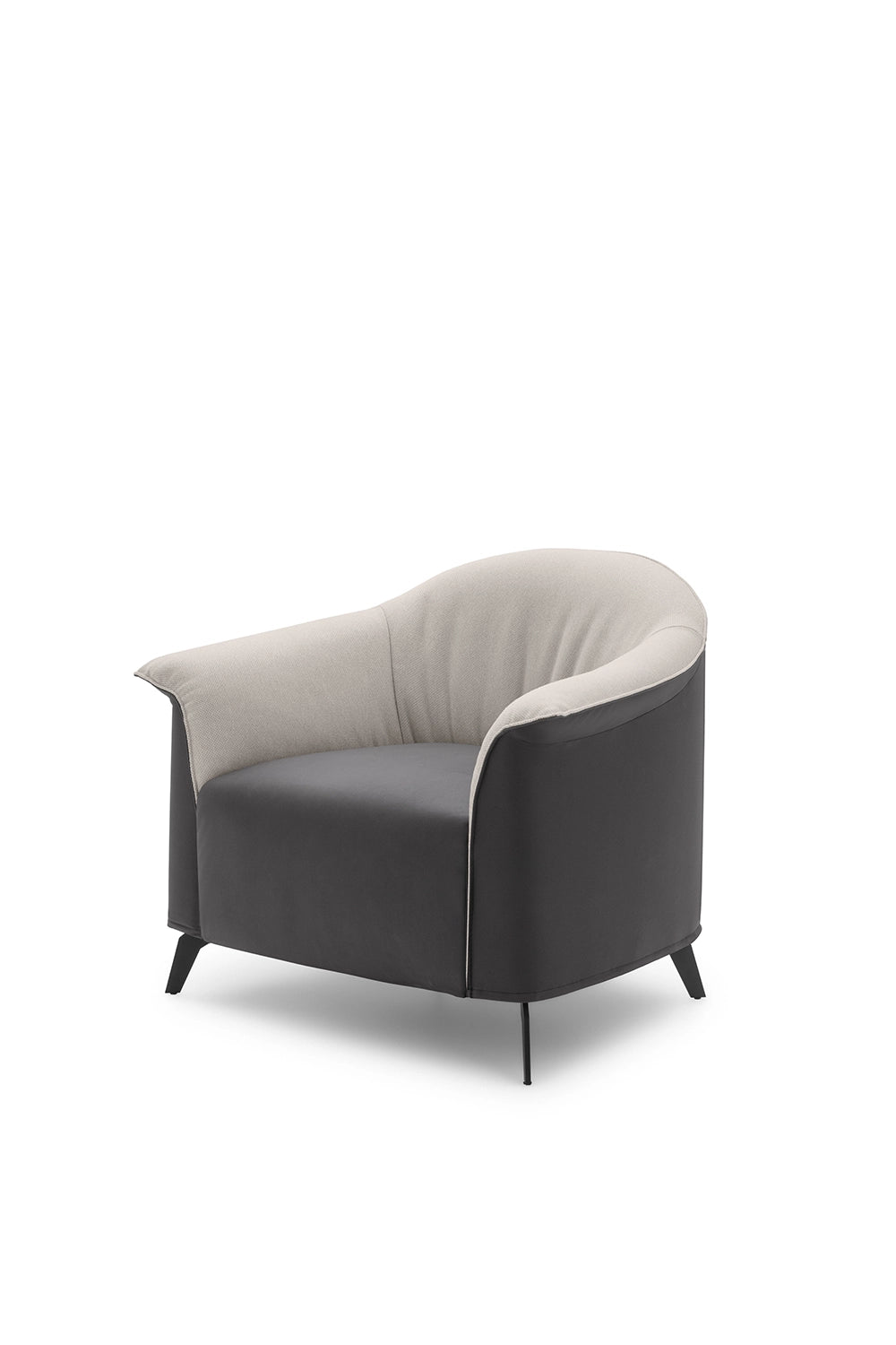 Experience comfort and creativity in one with Caroline Armchair. The deep, wide seat and unique lateral foldings break away from traditional design, while the contrasting upholstery adds a pop of color. Relax in the comforting embrace of the armrests and let your imagination roam free.