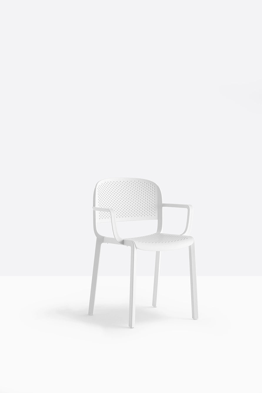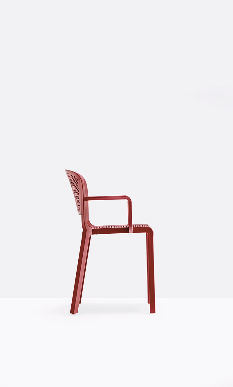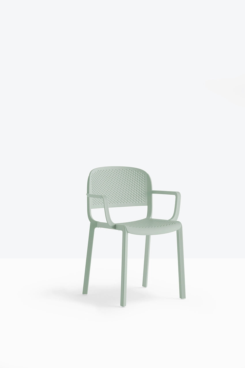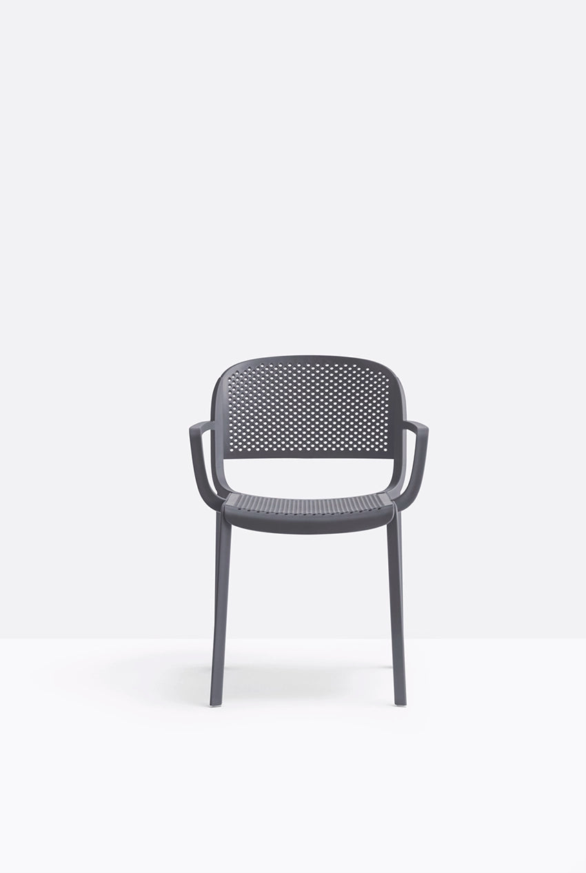 Dome is a collection of chairs that evokes the glorious tradition of bistro chairs with arched silhouettes and the generous shapes of the domes of monuments that embellish many cities in the world. Injection-moulded polypropylene armchair charged with glass fibre featuring delicate details that recall the joints of the wood. Stackable.