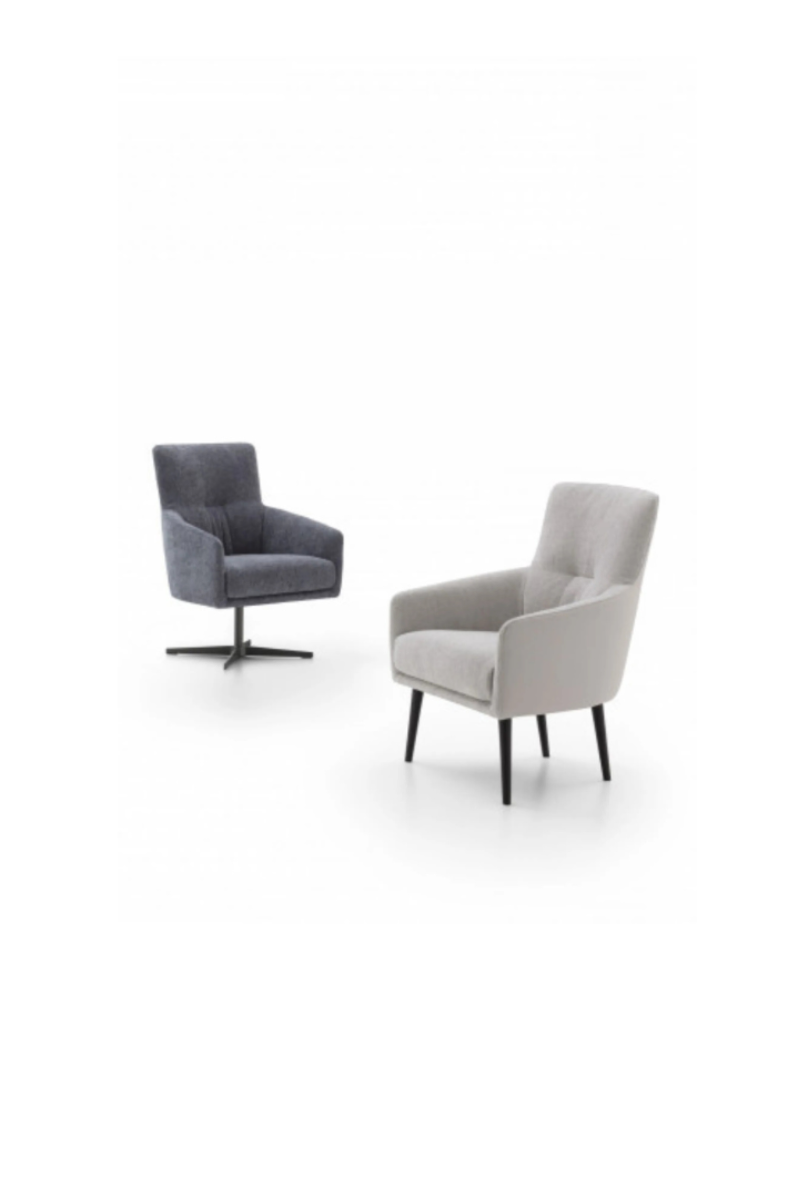 The Elodie armchair by Le Comfort is a perfect blend of elegance and comfort. Its sturdy frame, padded with non-deformable material, offers luxurious seating. Choose between sleek "Aaron" wooden feet or a modern "Sky" swivel base. Relax in style with Elodie.