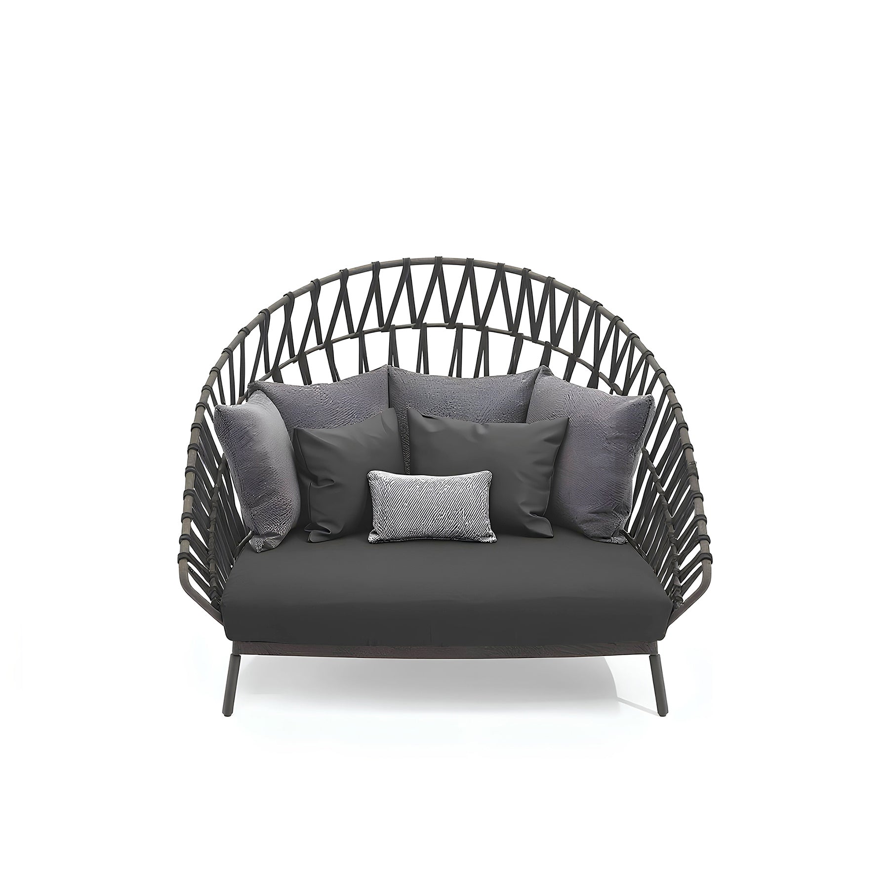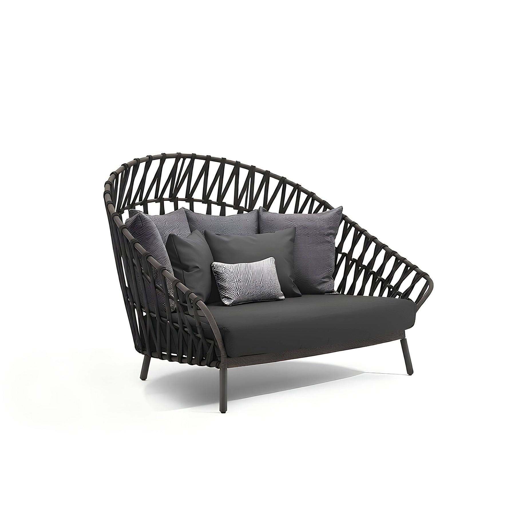 Combining the elegance of a sofa with the comfort of a daybed, it features a welcoming cocoon-style shape with integrated backrest and armrests. The handcrafted acrylic rope weave enhances the powder-coated aluminium frame, ensuring durability and refined aesthetics.