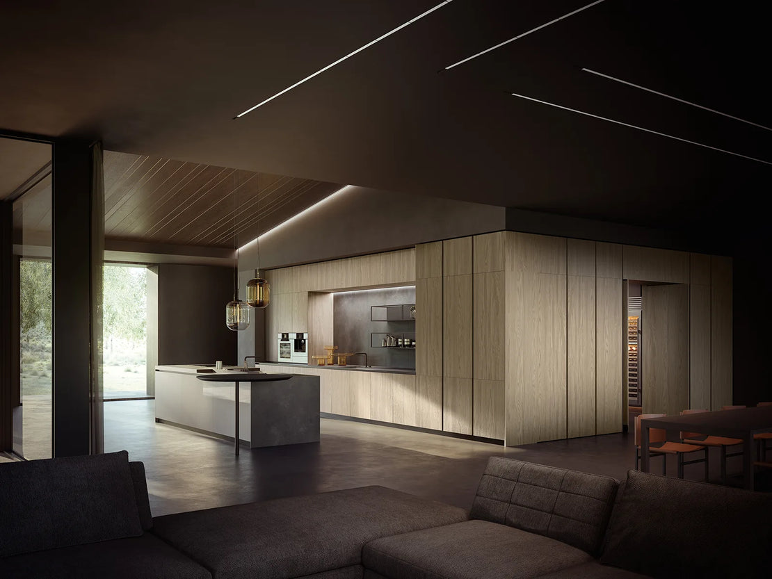 A kitchen that embodies modernity, combining the elegance of innovative materials with the technology of an aluminum frame door. This model formally explores contemporary lifestyles by blending technique and aesthetics, to showcase the beauty of Italian kitchen design.
