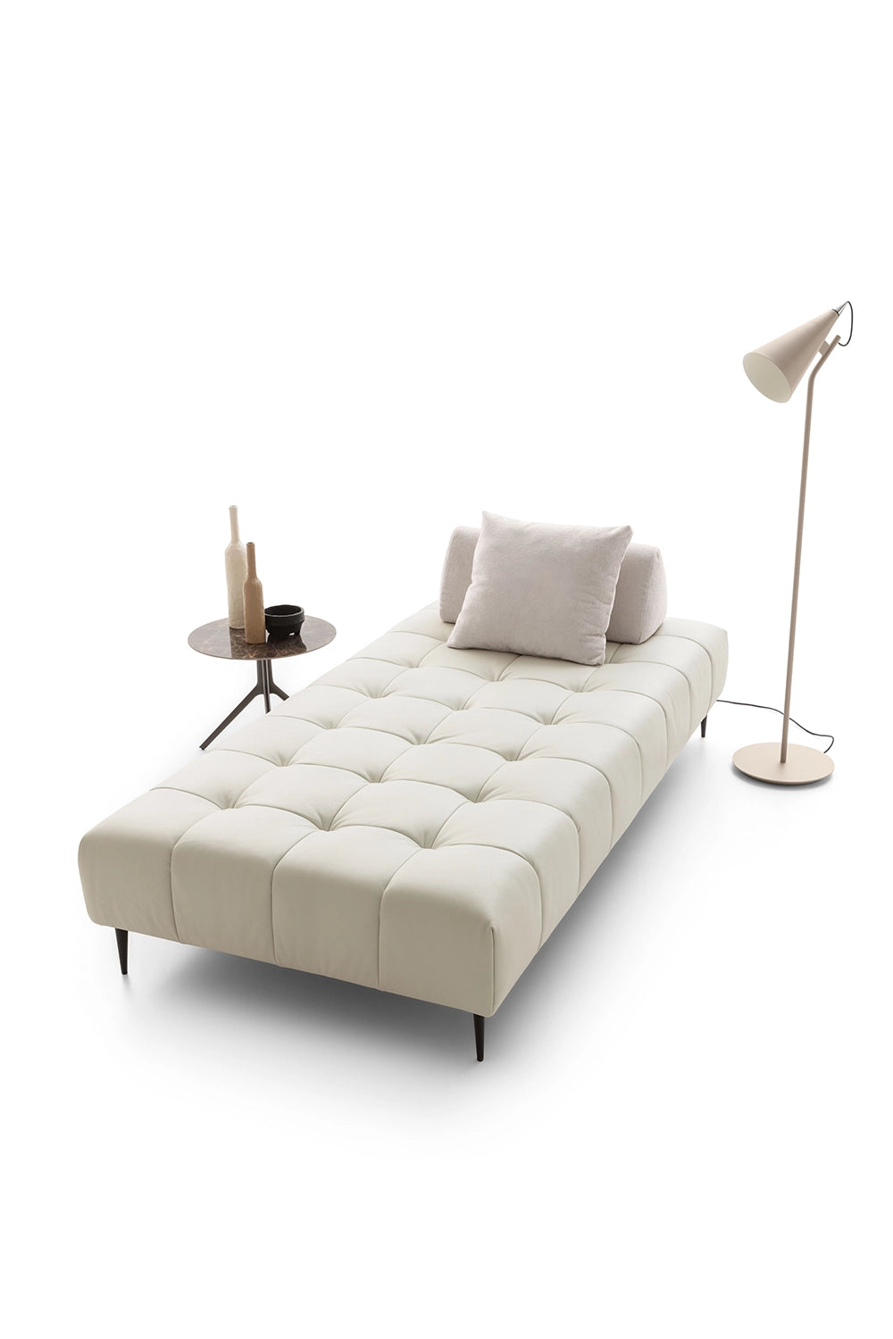 Elegant quilting creates inviting volumes, while sliding backrests increase seat depth. Upholstered in fabric or genuine leather, the design allows for creativity and maximum customization.